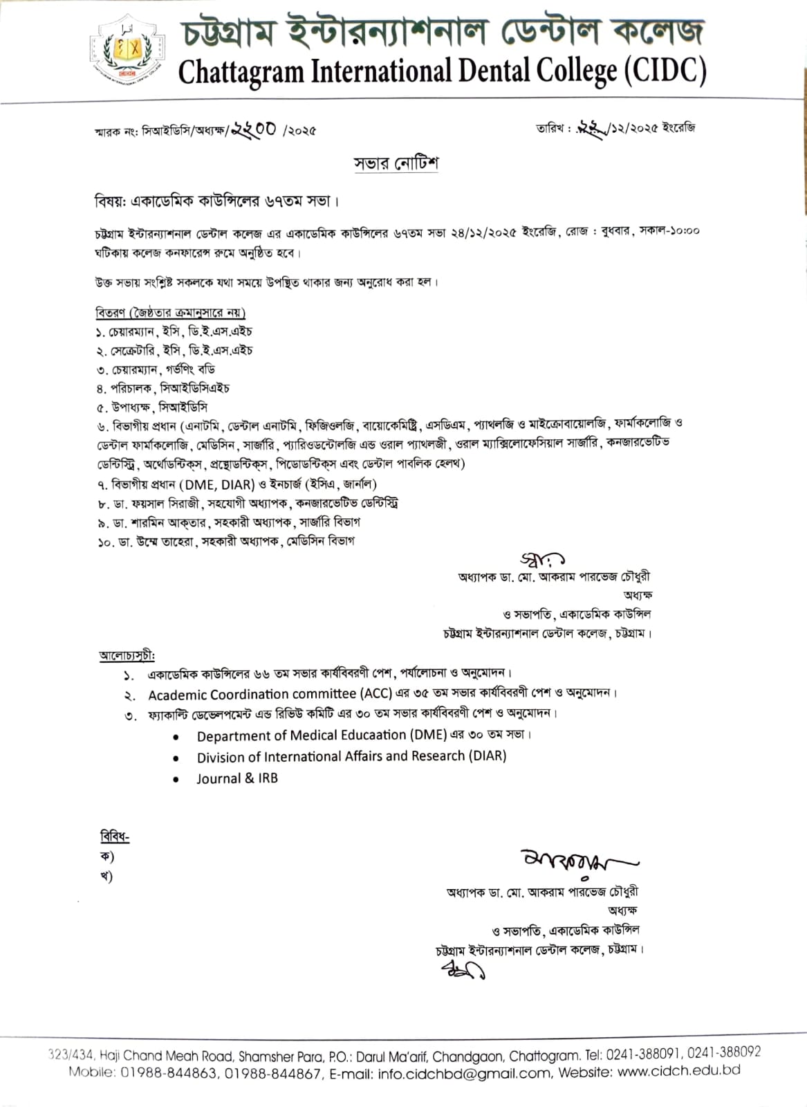 Chattagram International Dental College (CIDC) is approved by the Ministry of Health and Family Welfare, Government of the people’s Republic of Bangladesh, recognized by the Bangladesh Medical and Dental Council (BM&DC), affiliated by the Chittagong Medical University.